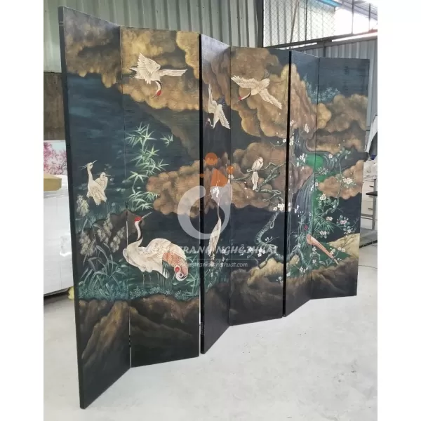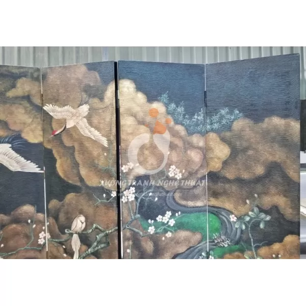 Tranh Bình Phong 06 Tấm Vẽ Bầy Hạc Trên Nền Vải Bố được vẽ trên nền vải bố đen dán phủ hai mặt rồi dán lá bạc ở nền cần vẽ hạc sau đó họa sĩ bắt đầu vẽ bức tranh bầy hạc..